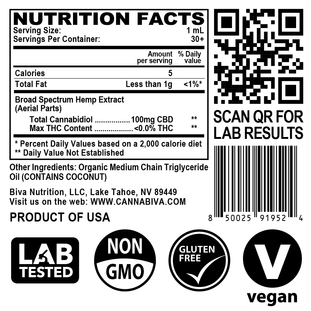 Cannabiva is formulated with organic MCT oil for optimum absorption and high concentrate broad spectrum distillate extracted from sustainably grown hemp in the Pacific Northwest – and it’s THC free!¹