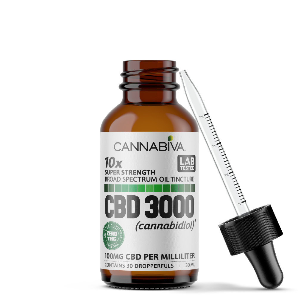 Cannabiva™ brand super strength 3000MG Broad Spectrum CBD Oil is 10 times stronger than our mildest formula and contains 100 milligrams of CBD per one milliliter dose with 3,000 milligrams of CBD per bottle.